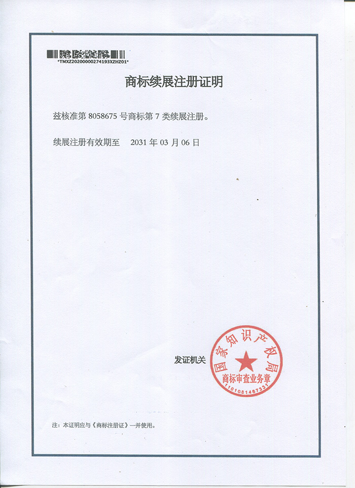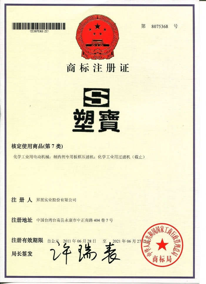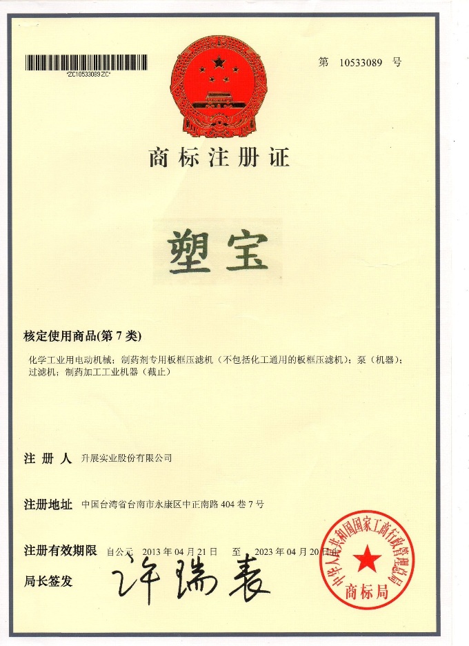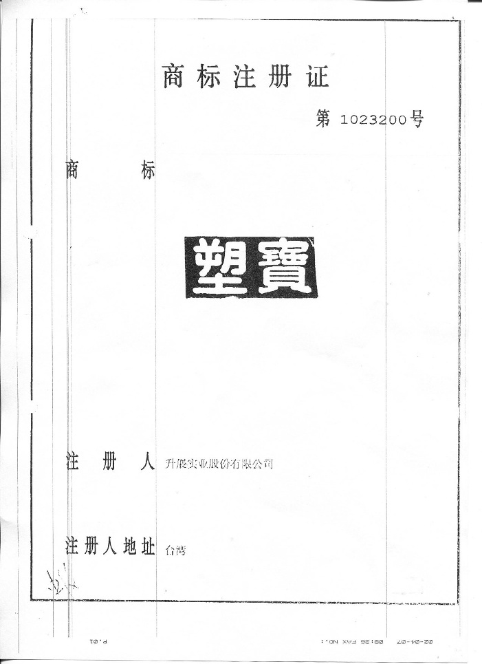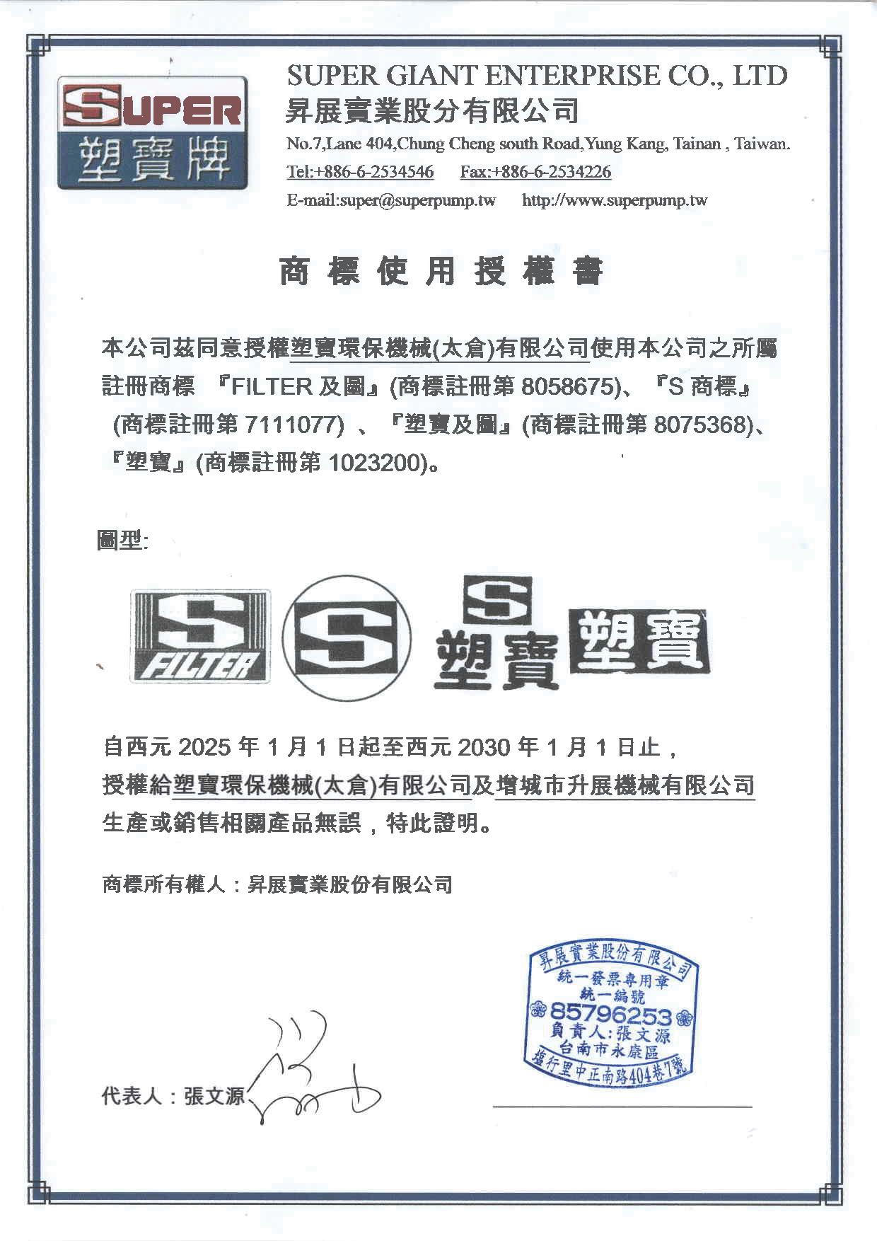 下列各式商標為本公司于大陸取得之商標注冊,僅授權(quán)太倉市塑寶環(huán)保機械及增城市升展機械公司使用,其余非經(jīng)我司書面許可而濫用者,本公司將采取法律行動,追索侵權(quán)之損害賠償。